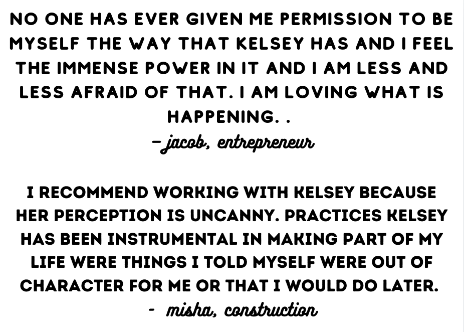 Kelsey is a force. she uses her gentle energy to guide you through your life. She helped me to bring lightness and clarity where and when I needed it. I can’t wait to continue my sessions with Kelsey. She’s a gift.
