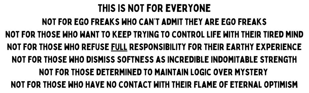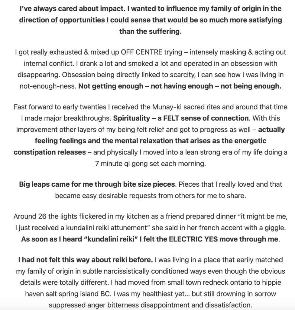 a choose your own adventure spacious container with a lot of bite size pieces to nibble chew gobble sip slurp pound grind … whatever your pleasure. your buy in here on mission NOW gets you access to all future rounds of this program too. a trippy layered spiraling inwards to ripple more and more permission outwards…