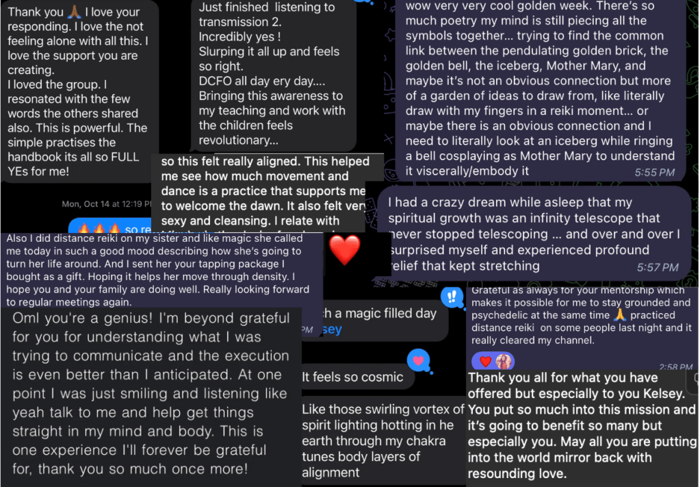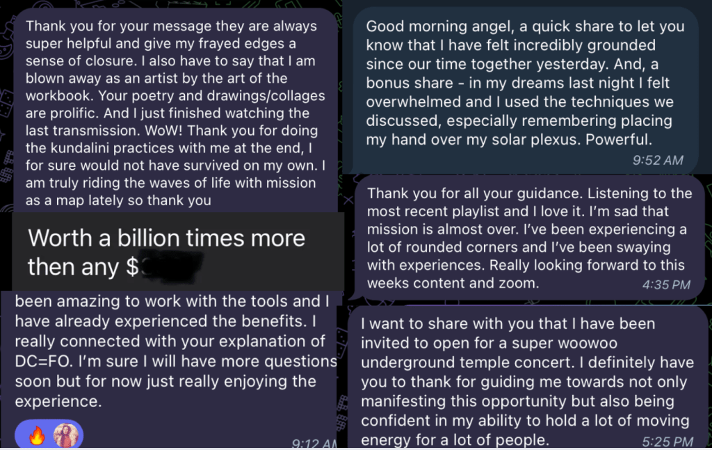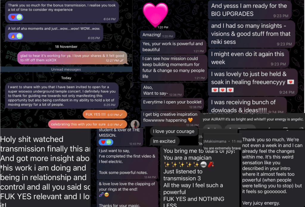 Mission Was the medicine that cracked many lifetimes of armour protecting my heart. The bitesize practises that were accessible within the chaos and overwhelm provided a way out of the clutches of fear, doubt, self hatred and anxiety. Master Kelsey’s unwavering ability to hold space for ALL OF IT opened a space Within uncovering a strength, a power, a knowing, a stability, 40 years of searching externally could not. Mission is beyond space, Beyond time, beyond earthly temptations and the limitations of finance. For me it has been a portal to The Holy Spirit alive within. I live in daily gratitude infinite and eternal for the frequency that is Mission channelled to these earthly realms through Master Q.